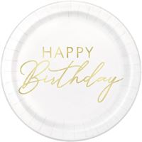 Celebrate in style with these elegant 7-inch gold Happy Birthday paper plates. Perfect for intimate gatherings, dessert tables, or cake service, this 8-count pack offers just the right amount for smaller celebrations. The shimmering gold finish adds a touch of sophistication to any party theme, while the sturdy paper construction ensures reliable use. Ideal for birthdays, anniversaries, or special occasions where quality details matter. Make every bite feel special.